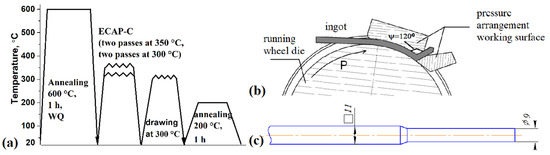 Schematic of the combined thermomechanical treatment of Ti-15Mo (a); ECAP-Conform process (b); drawing of the billet after ECAP-C, ready to be drawn (c).
