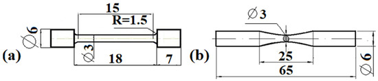 Tensile testing was carried out on an Instron 5982 machine (Instron Engineering Corporation, Buckinghamshire, UK) at 20 °C, in accordance with ISO 6892-84. The strain rate was 10−3 s−1. Cylindrical samples for tests with a gauge diameter of 3 mm were cut from the central portion of the rod in the longitudinal direction. A schematic of the samples is shown in Figure 2a. At least three samples were tested in each state.