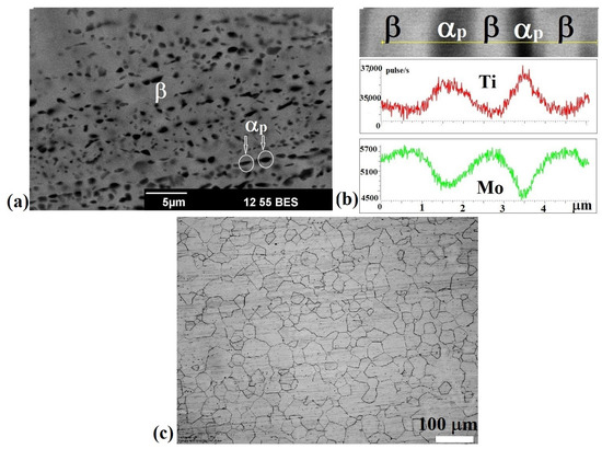 Microstructure of CG Ti-15Mo: (a) Initial (α + β)-state, longitudinal section, SEM; (b) EDS profile of the (α + β)-state; (c) β-state after quenching, OM.