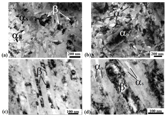 The combined thermomechanical treatment led to the refinement and fragmentation of both β-grains and αp-particles and to the formation of a sharp texture, which is typical of metals and alloys processed by drawing. Equiaxed β-grains with an average size of 150 ± 20 nm (Figure 4a), as well as particles of a primary αp-phase of globular morphology with an average size of 480 ± 30 nm and with a developed substructure inside, were observed in the cross section (Figure 4b). Elongated β-phase grains that were 35 ± 5 nm wide and oriented along the drawing direction, as well as recrystallized β-grains resulting from dynamic recrystallization and subjected to additional deformation with an average size of 100 ± 10 nm (Figure 4c,d), were found in the longitudinal section. In addition, the alloy contained particles of a secondary αs-phase of acicular morphology, 30 ± 5 nm in width, which precipitated during incomplete quenching of the alloy before deformation (Figure 4d). The volume fraction of the α-phase, determined by X-ray analysis, was 37%. A detailed description of the UFG microstructure after thermomechanical treatment is given in [36].