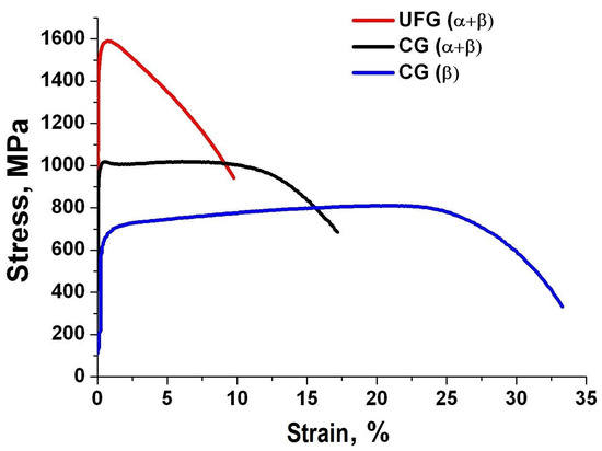 Typical engineering tensile curves for Ti-15Mo in CG (α + β), β- and UFG (α + β)-states.