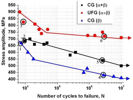 Wöhler fatigue curves (S-N) for Ti-15Mo in the CG and UFG states. 1, 2, 3: samples with a fatigue life of N < 104; 4, 5, 6: samples with a fatigue life of N ≈ 3 × 106