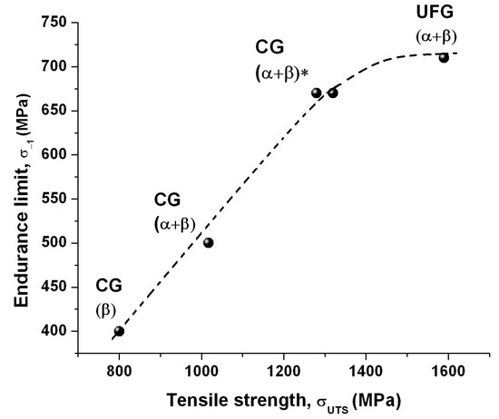 Figure 6 shows the Wöhler fatigue curves (S-N) of the alloy in the CG and UFG states, obtained during tests under the tensile-compression conditions, with a symmetrical load cycle frequency of 30 Hz. In the CG β- and UFG (α + β)-states, a knee of the S-N curve was observed during the transition from the low-cycle fatigue area to the high-cycle one. Moreover, in the UFG state, the knee was at the end of the low-cycle fatigue area and almost immediately reached the fatigue endurance limit, which is typical of high-strength materials [42]. One can see that the Wöhler curve of the UFG samples lies much higher than those of the CG samples. The UFG structure formation led to the enhancement of the cyclic properties, both in the low-cycle and high-cycle fatigue areas. It is known that the fatigue endurance limit of materials (σf) is directly dependent on the ultimate tensile strength (σuts) [35]. The greatest contribution to the increase of the mechanical properties of UFG materials is made by grain-boundary and dislocation strengthening [33]. As a first approximation, the Hall-Petch relation (2) is valid for the fatigue endurance limit, as well as for the tensile strength [33,35]. Therefore, the strength of metals increases with a decrease in grain size:
