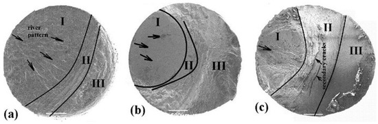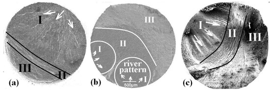 Figure 10 shows a general view of the fracture surfaces of the samples that fractured in the low-cycle fatigue region on the Wöhler curve (No. 4, 5, 6, Figure 6). In the β-CG sample, a fatigue fracture occupied a large part of the surface area. The fracture surface was rather flat (Figure 10a). As shown in the image showing the fracture surface of the (α + β)-CG sample, two radial fatigue cracks formed on the surface, as evidenced by river patterns (Figure 10b). The fatigue fracture zone occupied almost a half of the fracture area but was still smaller than that in the β-CG sample. The fracture surface (α + β)-UFG had a developed non-smooth relief; the relief of zone II was flaky (Figure 10c). The fatigue fracture region, similar to in the (α + β)-CG sample, occupied almost half of the fracture surface.