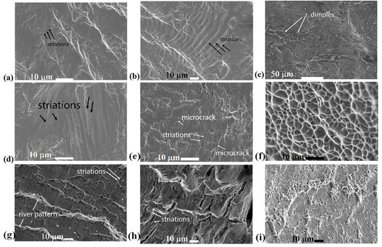 The zone of stable growth of a fatigue crack in the UFG sample had a rough, quasi-brittle relief with steps, on which fatigue striations were located with a step of 2 ± 0.2 µm (Figure 9g). The zone of accelerated growth was characterized by a rough striated relief; deep secondary microcracks were clearly visible between the striations (Figure 9h). Secondary cracking in the UFG sample occurred much more intensively than in (α + β)-CG (Figure 9e). Fatigue striations had a brittle appearance; their step was 4 ± 0.2 µm. In the overload zone, low ductile ridges and flat areas were found with dimples smaller than 1 µm (Figure 9i). The edges of the dimples were quite high compared to their diameter. The dimples in the UFG sample had much smaller sizes than those in the CG samples (Figure 9c,f).