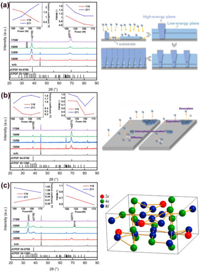 where, and are the measured intensity of the plane and standard intensity in the JCPDF card, respectively, and N is the number of reflections. The larger the , the higher the orientation degree of the plane. The fluctuation of and of α-Ta as a function of Pspu is shown in the top-left corner of Figure 2a. It is discovered that the value decreases while the value grows with increasing Pspu from 100 W to 175 W. As is shown in Figure 2a, the different crystallization processes of coatings with different thicknesses will affect the crystallization orientation. In the early growth stage, the plane with low surface energy occupies a large coverage area. When the island growth ends, the plane with high surface energy and a high longitudinal growth rate becomes higher and subsequently expands into the surrounding area, contributing to the compression of the plane with low surface energy. In the middle and late growth stages, the proportion of the plane with high surface energy eventually exceeds the plane with low surface energy. Meanwhile, as can be seen in the top-right corner of Figure 2a, the FWHM of (110) and (211) decrease with increasing power, indicating better crystallinity at the higher power [19]. In addition, the FWHM is related to both crystallite size and the stress of the crystallites. These effects can be separated using the Williamson–Hall method [20]. With the increase in sputtering power, the ionization rate of Ar will lead to the increase in deposition rate and more Ta atoms will accumulate near the nucleation point, resulting in an increase in the grain size of the Ta coating. As can be seen from Figure 2a, the diffraction peaks of coatings are getting closer to the standard peak lines with increasing power, meaning reduced stress. Therefore, the increased crystallite size and reduced stress together promote the decrease in FWHM.