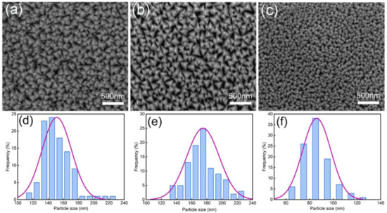 Figure 4 shows the surface morphology and grain distribution histogram of the Ta coatings deposited at Tsub-Pspu of 200 °C-175 W (Figure 4a,d), 300 °C-150 W (Figure 4b,e), and 400 °C-100 W (Figure 4c,f), respectively. The size distribution histograms were obtained by measuring more than 100 grains from the FESEM images.