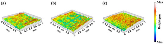 Figure 5 shows the 3D profiles of Ta coatings in different deposition conditions. Compared with the microstructural images obtained through SEM observation, the 3D profile contains a larger observation interval which is more suitable for observing the overall morphology distribution of millimeter-level samples. The surface height data of the Ta coating under different conditions were obtained according to the 3D profiles, as is listed in Table 3. Root mean square heights (Sq) of Ta coatings at 200 °C-175 W, 300 °C-150 W, and 400 °C-100 W were 0.0402 μm, 0.0184 μm, and 0.0132 μm, respectively. Arithmetic mean heights (Sa) of Ta coatings at 200 °C-175 W, 300 °C-150 W, and 400 °C-100 W were 0.0319 μm, 0.0145 μm, and 0.0103 μm, respectively. The results indicate that the surface of the Ta coating at 400 °C-100 W is flatter, while the roughness of the Ta coating at 200 °C-175 W is higher. According to the histogram results of the grain distribution in Figure 4, the coating grain size distributions at 400 °C-100 W and 300 °C-150 W have a concentrated grain size distribution, while the coatings at 200 °C-175 W are quite distributed between 130 nm and 170 nm, resulting in higher roughness.