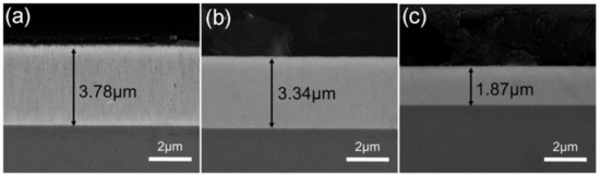 The coatings exhibit a typical columnar crystal growth pattern mainly affected by the shadowing effect. The anisotropy of columnar crystal growth leads to a large competitive advantage for those crystals growing perpendicular to the interface, and columnar crystals in other directions are submerged as the coating thickens. In addition, the thicknesses of Ta coatings are approximately 3.78 μm, 3.34 μm, and 1.87 μm, respectively. When the sputtering power increases, the sputtered Ta atoms from the target increase, resulting in a high sputtering rate. However, according to the theory proposed by Kim et al. [26], a lower deposition rate enables atoms to move through the crystals across larger regions, and atoms are unlikely to be covered by subsequent adatom flux before being dampened in a particular location, potentially improving the mechanical properties of materials.