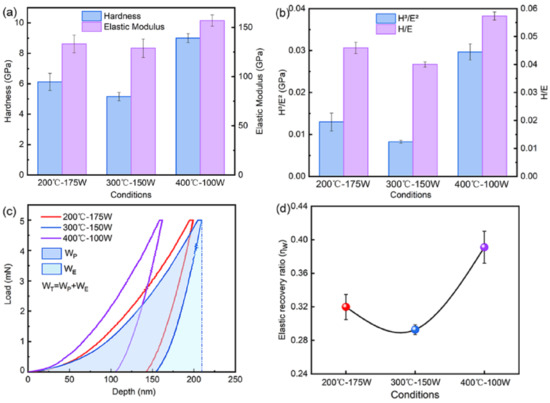 The load–depth curves of Ta coatings at various sputtering conditions are illustrated in Figure 7c. The coatings were complied with an elastoplastic deformation according to the curves. In the nanoindentation test, some of the total energy (WT) was recovered as reversible elastic energy (WE), while some was lost as irreversible plastic deformation energy (WP). The elastic recovery ratio (ηw), which can be defined as ηw = WE/WT, is a measure to express the response of a material to indentation [30,31]. Take the coating prepared at 300 °C-150 W as an example; WE and WT are given by the areas under the loading and unloading curves, respectively, as shown in Figure 7c. The coating prepared at 400 °C-100 W has a higher ηw value of 0.39 in Figure 7d, indicating better resilience.