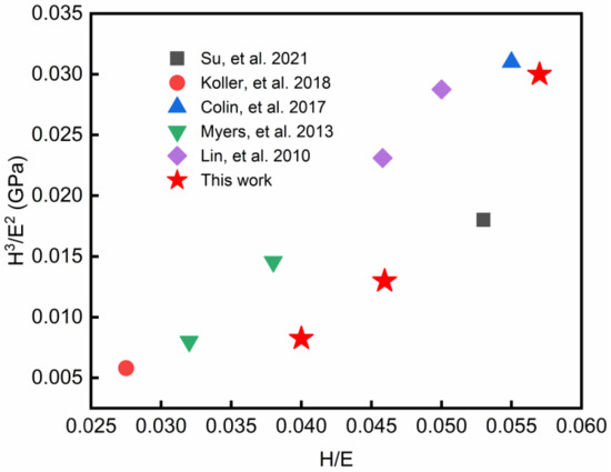 Figure 8 shows the comparison of the H/E and H3/E2 of α-Ta coatings prepared in this work with other literatures. In previous studies, the H/E and H3/E2 varied within a range of 0.0275–0.055 and 0.0058–0.031 GPa, respectively. Compared with other studies, the α-Ta coating at 400 °C-100 W in our work has higher H/E and comparable H3/E2 in contrast to G. Abadias et al. [21], which can be attributed to its high densification and homogeneous structure.