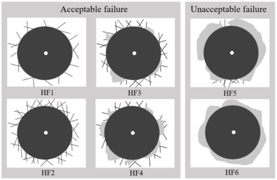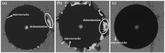 The adhesive performance was evaluated according to the reference standard. The standard diagram is shown in Figure 9, where grades one to four are acceptable failure and five to six are unacceptable failure. Figure 10 shows the results of the testing of α-Ta coatings under different conditions. The coatings prepared at 200 °C-175 W and 300 °C-150 W showed cracks and delamination, and the coating prepared at 300 °C-150 W peeled off from the substrate more seriously. Therefore, the coating ratings at 200 °C-175 W and 300 °C-150 W were HF3 and HF4, respectively. The coating prepared at 400 °C-100 W showed good adhesion without obvious delamination around the indentation. Compared with Figure 9, the overall coating rating was HF1. The better adhesion of the coating under 400 °C-100 W may be related to the dense structure and higher hardness.