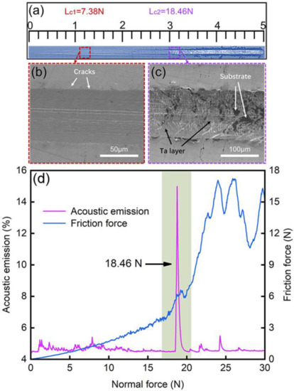 The scratch morphologies of the Ta coating at 400 °C-100 W are shown in Figure 11a. As the applied load increases, the scratch width of the Ta coating surface also gradually increases, and the scratch area is clearly visible. In the scratch test, Lc1 is the corresponding load when cracks begin to appear and Lc2 is the minimum load for continuous peeling between the coating and the substrate, indicating the failure of the adhesion of the coating-substrate system. Usually, Lc2 is used to determine the failure of the coating [35]. From the enlarged image of Lc1 in Figure 11b, the appearance of small cracks can be seen, and the enlarged image of Lc2 in Figure 11c demonstrates that the coating begins to peel off from the substrate at this time, exposing the color of the substrate. According to the micro scratch curves in Figure 11d, it can be seen that Lc1 = 7.38 N and Lc2 = 18.46 N. The larger the Lc1, the stronger the cracking resistance of the coating. The longer the distance between Lc1 and Lc2, the better the coating’s resistance to crack propagation [36]. In previous work, Su et al. [32] found that mono-DC Ta coatings reached optimum adhesion compared with mono-PP and multi-PD coatings. The first fracture of mono-DC coating occurred when the load reached ~320 mN because the main diffraction peaks were β-Ta. Furthermore, Ay Ching Hee et al. [37], using DCMS technology, observed that the initiation of cracking in Ta coatings was at 2.5 N and the second critical load was at 18.6 N, with the coating separating from the substrate.
