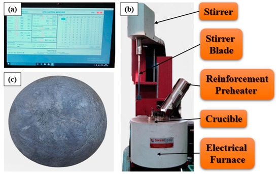 Schematic representation of the experimental arrangement for the stir casting process: (a) control section, (b) stir casting machine, and (c) prepared sample.