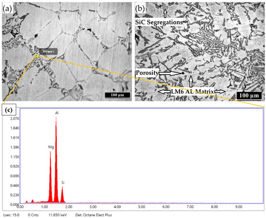 Optical Microscopy Micrograph of (a) LM6 base alloy at 200x (b) MMC at 200x; and (c) corresponding EDS spot analysis LM6 base alloy.