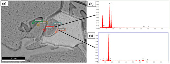 (a) SEM-BES morphology of MMC and EDS spectra of (b) SiC reinforcement and (c) LM6 base matrix.
