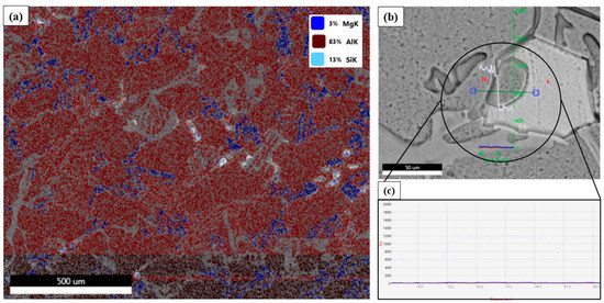 EDS analysis of fabricated MMC in (a) map of Mg, Al, and Si content and (b) line-scan method representing Si content.