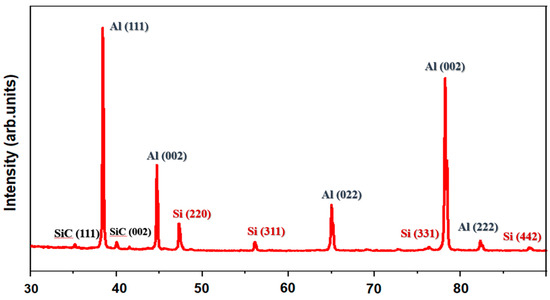 The EDS analysis of the fabricated MMC was obtained with the intention of accurately estimating the compositional variation and distribution. Furthermore, EDS analysis lays down the foundation to conduct the investigation on detecting the elements present, which can further be confirmed by the successful analysis of XRD peaks. The EDS spot analysis as shown in Figure 4 displays an expected behaviour, with the EDS peak represented in Figure 4b with a darker grey tone in colour revealing high peaks of Al, Si, and C; this indicates the morphological feature to be SiC reinforcements. Similarly, the second spot analysis displayed in Figure 4c indicates one considerably high peak for Al, evidencing the morphological feature with light grey tone to be the LM6 base alloy matrix. A more precise quantitative analysis was obtained from the EDS map analysis and is presented in Figure 5a, where the elemental distribution is revealed in terms of comparative weight percentages. Apart from the expected high weight percentage of Al and Si, the presence of Mg was also detected, which can be explained by the addition of the master alloy, as mentioned in the fabrication procedure in the “Materials and Methods” section.