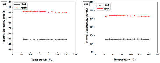 Comparative plots of (a) thermal diffusivity and (b) thermal conductivity of LM6 base alloy and fabricated MMC.
