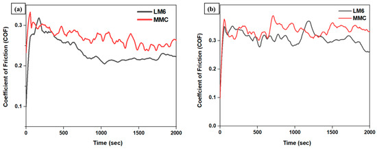Comparative CoF plots of LM6 and MMC at (a) room temperature and (b) elevated temperature of 175 °C.