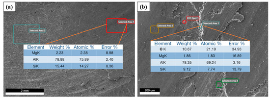As for the increase in the wear rate with the increment in temperature for LM6, the onset of transition from mild to severe wear [56] due to the frictional heat reaching the critical value (0.4 time of the melting temperature of the alloy) can be considered responsible. However, in the present study, such a transition of wear magnitude is not visible from the specific wear rate values, which display a contradicting behaviour with a decline in wear rate with an increase in temperature. This can be easily explained by the fact that 175 °C is not sufficient to trigger the transition from mild to severe wear. Hence, the fabricated MMC can be considered a durable alternative to withstand the friction-induced heat generation. Furthermore, elevated temperatures might result in thermal-activated slip systems that successfully counter the effect of strain hardening caused at ambient temperatures by the action of counter body load along the wear track. This also supports the investigations surrounding the decrease in wear rate at elevated temperatures. Furthernore, the EDS analysis of the wear track of the fabricated MMC at ambient and elevated temperature presented in Figure 9 revealed the presence of a mechanical mixed layer (MML) for investigations at 175 °C.