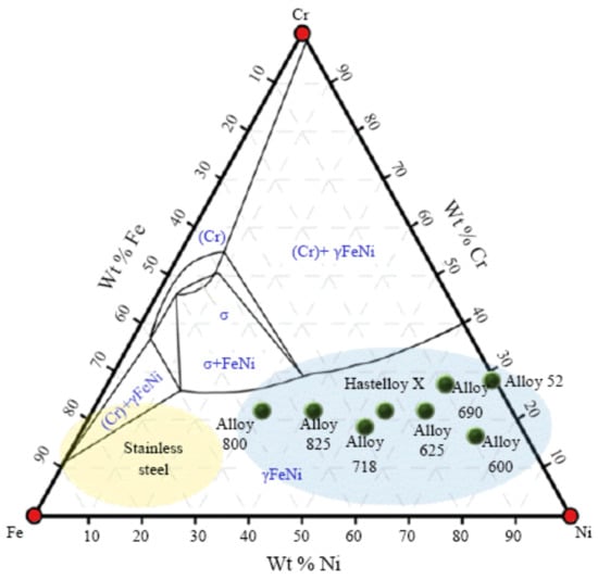 With the increasing requirement to achieve the best thermal efficiency in the field of aeronautics [1,2] and energy power plants steam turbines [3], applications in which aluminium and steel would succumb to creep [4] as a result of thermally induced crystal vacancies [5], nickel-based (Table 1) alloys became a very attractive solution for high-temperature operation [6,7,8,9]. Ni-Cr-Fe superalloys (Figure 1, blue zone), better known as INCONEL® (trademark registered by the International Nickel Company of Delaware and New York [10]), are materials resistant to oxidation, caustic and high-purity water corrosion, and stress-corrosion cracking (SCC) [11], optimal for service in extreme environments subjected to high mechanical loads [12], within numerous applications and characteristics (Table 2).