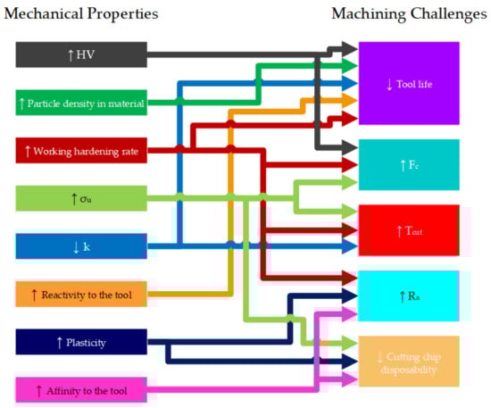 Relationship between mechanical properties and machining challenges with INCONEL® (adapted from [19]).