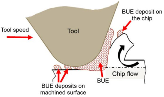 As a consequence of low k [36] of nickel-based alloys, which significantly influences heat distribution during the machining process, the surface integrity is affected when applying traditional cold forming techniques, due to the rapid work hardening (Figure 3) in the chip formation region [63]. This phenomenon leads to plastic deformation of either the INCONEL® workpiece or the tool, on subsequent machining passes [64], eventually resulting in built-up-edge (BUE) formation [31] (Figure 4) and consequentially in premature tool failure [65]. For this reason, age-hardened INCONEL® alloys, such as the 718 alloy, are typically machined using an aggressive but slow cut with a hard tool, minimizing the number of passes required [66].