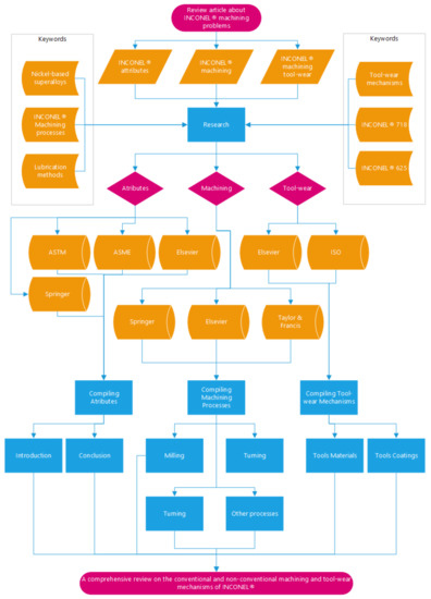 The research and information compiling method are illustrated in the flowchart of Figure 5, which is simple to visually interpret and track down all the inherent steps in the making of this specific paper. In the flowchart, all the consulted databases and most used keywords are found (in the topic of this document), to find information about conventional and non-conventional machining and tool-wear mechanisms of INCONEL® alloys.