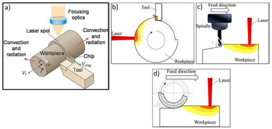 (a) Schematic of LAM indicating heat-losses by convection and radiation, (b) Schematic of LAM turning, (c) LAM milling, and (d) LAM grinding (adapted from [75]) (Caption: Vf—feed velocity).