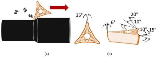 (a) Turning example; (b). Insert A-type (view of basic side cutting edge angle, rake angle, and secondary angles for chip breakage) [84].