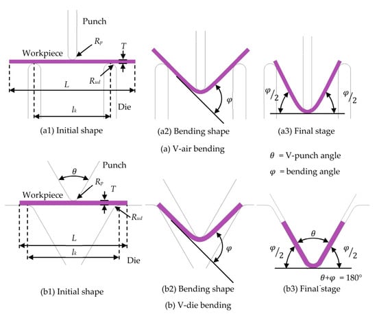 - There was a difference in bending mechanisms between the V-air and V-die bending processes. Specifically, the bending allowance zone on the bend radius was formed in the case of the V-air bending process; in contrast, a reversed bending allowance zone on the legs was also formed in the case of the V-die bending process.
