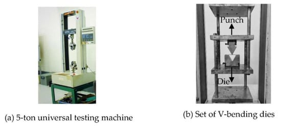 To validate the FEM simulation results, laboratory experiments were performed. As per the experiments in past research [16,30], Figure 4 shows the press machine, which includes a five-ton universal tensile testing machine (Lloyd Instruments Ltd., Hampshire, UK) and a set of V-bending dies. In the present research, in the experiments, five samples from each bending condition were used to inspect the obtained bend angles and bending force. The bend angle after unloading was measured using a profile projector (Mitutoyo Model PJ-A3000). The amount of spring-back was calculated based on the obtained bend angles, and the average spring-back values with the standard deviations (SDs) were reported. These were compared with the bend angles analyzed by the FEM simulation. The bending forces were also recorded and the average maximum bending force values with the standard deviations are reported. In practice, the magnitude of this force varies greatly with the amount of punch displacement. In the present research, the value of the maximum bending force was determined both experimentally and in the FEM simulation by setting the bending stroke where the gap between the punch and the die was equal to the material thickness, and then recording the maximum bending force. Again, the results were compared with the bending force analyzed by the FEM simulation.