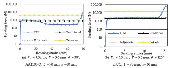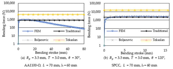 As above mentioned, based on the traditional and modified V-die bending forces as listed in Equations (1)–(3), Figure 6 shows a comparison of bending forces obtained using the V-die bending force formulas and FEM simulation. The results show that the V-die bending forces predicted using the V-die bending force formulas do not completely agree with those predicted by FEM simulations. Although it is noted that the use of modified V-die bending force formulas achieved more accuracy in V-die bending force calculation compared with using the traditional V-die bending force formula, the errors for the calculated V-die bending forces were still very large compared with those predicted using FEM simulation. Namely, the V-die bending force calculated using the traditional V-die bending force formula was approximately 34.0 times less than that predicted using FEM simulation. After using the modified V-die bending force formulas of Boljanovic [22] and Tekaslan [21], the calculated values were less than those of FEM simulation prediction by approximately 27.4 and 4.9 times, respectively.