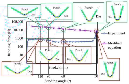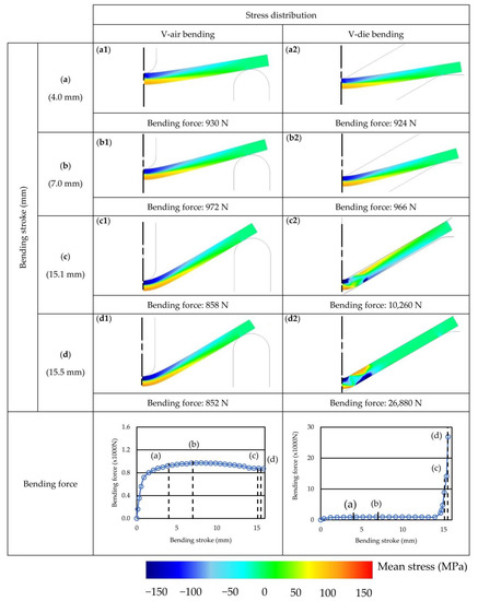 To improve the V-die bending force formula, a different bending mechanism between the V-air and V-die bending processes must be clearly understood. Figure 8 shows a comparison of the bending mechanism between the V-air and V-die bending processes. As shown in Figure 8a, for a bending stroke of approximately 4 mm, the same manner of stress distribution analysis can be observed. The workpiece was bent based on a three-point bending mechanism in both the V-air and V-die bending processes. This bending mechanism agrees well with the bending theory and literature [15,16,30]. In terms of the bending force, the results again show the same manner of predicted bending force. The results were approximately 930 and 924 N in the case of the V-air and V-die bending processes, respectively. As the bending stroke increased, the workpiece was continuously bent by the three-point bending mechanism for both the V-air and V-die bending processes, and the same manner of stress distribution analysis could again be observed. As shown in Figure 8b, this resulted in increases in the bending allowance zone. Compression stress generated on the inner radius and tensile stress generated on the outer radius were also increased. Again, based on the same three-point bending mechanism in both the V-air and V-die bending processes, similar bending forces were predicted. These were approximately 972 and 966 N for the V-air and V-die bending processes, respectively. With a bending stroke of approximate 15.1 mm, the workpiece was continuously bent based on the three-point bending mechanism in the case of V-air bending process, as shown in Figure 8(c1). The bending allowance zone and the stress generated in this zone rarely changed. The bending force slightly decreased. In contrast, in the case of the V-die bending process shown in Figure 8(c2), the legs of the bent section made contact with the punch, and then the workpiece was not only bent based on a three-point bending mechanism. As the workpiece was bent on the bend radius, the legs were again bent towards the sides of the die simultaneously. A reversed bending allowance zone was formed on the legs of the bent sections, in addition to the bending allowance zone on the bend radius. This bending mechanism agreed well with the literature [15,16,30]. Based on these bending mechanisms, the bending force steeply increased to approximately 10,260 N. It was noted that the V-die bending force was approximately 12 times larger than the V-air bending force. With the end of the bending stroke as shown in Figure 8d, as the same manner of bending mechanism was used for the previous bending stroke, the V-air bending process exhibited only the three-point bending mechanism but the V-die bending process exhibited the reversed bending mechanism in addition to the three-point bending mechanism. The V-air bending force slightly decreased to approximately 852 N. In contrast, owing to the legs making full contact with the punch and die, the reversed bending stresses were steeply increased. Therefore, the V-die bending force significantly increased to approximately 27 kN. This was approximately 32 times larger than the V-air bending force. These results clearly show that, in order to calculate the V-die bending force, consideration is required not only of the force required to form the bending allowance zone on the bend radius, but also the force required to form the reversed bending allowance zone on the legs.