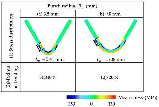 Figure 9 shows a comparison of the stress distribution analyses for the workpiece before unloading with respect to the punch radius. The larger the punch radius applied, the larger the bending allowance zone generated. In addition, the reversed bending allowance zone decreased as the punch radius increased. This resulted in the differences in the calculated V-die bending forces. These types of stress distribution analyses, and zones of bending and reversed bending, agree well with bending theory and the literature [15,16,30]. The results show the decrease in the V-die bending force as the punch radius increases.