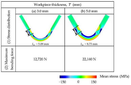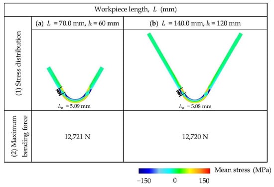 Figure 12 shows a comparison of the stress distribution analyses for the workpiece before unloading with respect to workpiece length. The results show the same types of stress distribution analyses with respect to workpiece length. Furthermore, the areas of the bending and reversed bending allowance zones are similar. These types of stress distribution analyses and zones of bending and reversed bending agree well with bending theory and the literature [15,16,30]. Therefore, this resulted in the same calculated V-die bending forces. However, in this instance, as the sample length increased, the distance between supports increased in order to achieve complete V-die bending. As a result, the longer sample had a longer bending stroke than the smaller sample.