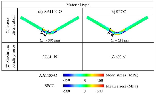 Figure 13 shows a comparison of the stress distribution analyses for the workpiece before unloading with respect to material type. The results show the different types of stress distribution analyses. The generated stresses for the bending and reversed bending allowances in the case of SPCC were larger than those in the case of AA1100-O. However, the areas of the bending and reversed bending allowance zones were similar. These types of stress distribution analyses and zones of bending and reversed bending agree well with bending theory and the literature [15,16,30]. Due to the differences in mechanical properties, i.e., ultimate tensile strength, the difference in calculated V-die bending forces can be noted.