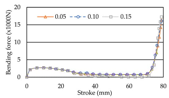 Bending forces calculated by FEM simulation with respect to friction coefficients. ( = 3.5 mm, = 3 mm, = 30°, = 70 mm, lk = 60 mm, SPCC).