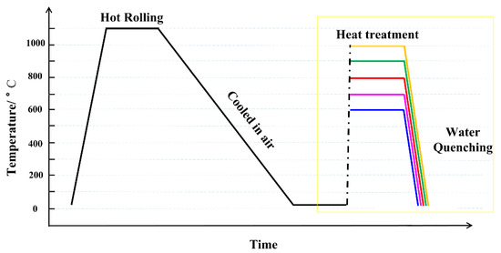 A coil of Fe-25Cr-5Al-RE wire with a diameter of 6.5 mm was produced by Taiyuan Iron and Steel Corporation (TISCO) in China. It was prepared in a repeated hot-rolling process at 1100 °C and cooled in the air (Figure 1). The chemical composition of the steel is listed in Table 1; this information was provided by TISCO and measured using a spectrometer. The hot-rolled Fe-25Cr-5Al-RE wire was first uncoiled and then cut into small pieces (wire rods). The Fe-25Cr-5Al-RE wire rods were strengthened with the vise and hammer, thus rending the uniformed collimation among the different samples. In the thermal treatment process (Figure 1), the Fe-25Cr-5Al-RE wire rods were put into the furnace at various stable temperatures, set at 600, 700, 800, 900, and 1000 °C, respectively. After 60 m, the samples were transferred into water for quenching. All the preprocesses were performed in air.