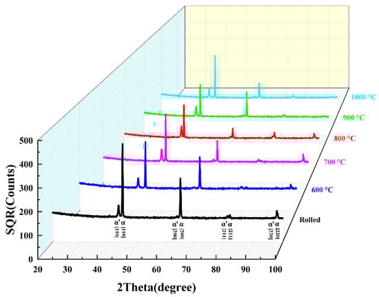 The precipitates are in a micro-sized sphere when heat-treated at 800 and 900 °C. Considering the rich chromium and aluminum, the micro-sized spherical precipitates are also the α′ phase. Compared with the lamellar α′ phase heat-treated at 600 and 700 °C, the micro-sized spherical precipitates contain more aluminum elements. Containing more chromium and aluminum elements with smaller atom radii, the lattice constant of α′ phase becomes smaller for the chromium and aluminum atoms replacing iron atoms. As Kabayashi has demonstrated, the dissolving of more aluminum elements serves to destabilize the α′ phase and allows for increased Cr solubility [21,22]. Compared with the lamellar α′ phase, the α′ phase in the spherical structure has more (110) planes, thus increasing the irradiated planes. As a result, the {110} diffraction peak is enhanced when heat-treated at 800 °C. When the heat-treated temperature is set at 1000 °C, the α′ phase has been dissolved into the α substrate again.