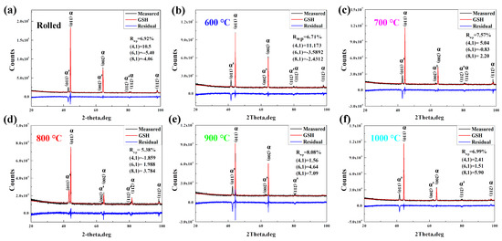 The agreement between measured and calculated XRD profile for the rolled and annealed Fe-25Cr-5Al-RE wire rods following Rietveld refinement with generalized spherical harmonics description (GSH) for preferred orientation correction. (a): rolled; (b): 600 °C; (c): 700 °C; (d): 800 °C; (e): 900 °C; (f): 1000 °C.