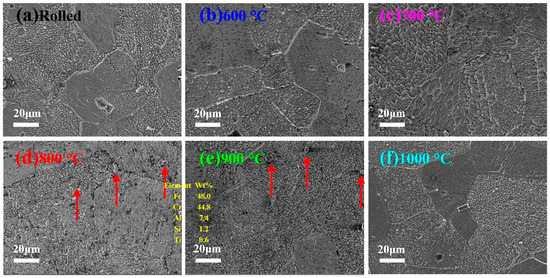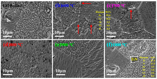 When the heating temperature increased to 800 °C (Figure 4d and Figure 5d), no visible precipitates in the lamellar structure could be detected. Yet, the round precipitates (marked with red arrows) in a few microns can be observed both in the grain and along the grain boundary. When heat-treated at 900 °C, the number of micro-sized precipitates was less than that at 800 °C. As confirmed by the EDS technique, the typical micro-sized precipitates in sphere morphology were also rich in chromium elements but continued to have more aluminum elements. As shown in Figure 4f and Figure 5f, there were no apparent precipitates in the lamellar structure and micro-sized sphere when heat-treated at 1000 °C. The large precipitates (mark in TiN) with sharp edges can be reckoned as titanium nitride (TiN) [20].