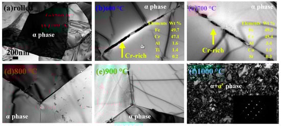 The α′ phase is distributed along the grain boundary or in the grain of the α phase. The less the difference in the lattice constant between the α and α′ phases, the better conjunction between the two phases, thus strengthening the Fe-25Cr-5Al-RE alloys. At the crystallite scale, the α′ phase has been dissolved into the α substance after hot-rolling [23,24]. When quenched at 600~900 °C, the α-(Fe, Cr) ferrite phase is separated into Fe-rich ferrite (α) and Cr-rich chromium ferrite (α′) phases. The α-α′ phase separation induces a stress field (misfit between the α and α′ phases) that hinders dislocations from propagating. At the heating temperature of 600 and 700 °C, the α′ phase is in a lamellar structure and distributed along the grain boundary, enclosed by the lowest surface energy (110). When quenched at 800 and 900 °C, the α′ phase is present with spherical morphology but distributed both in the grain and along the grain boundary.