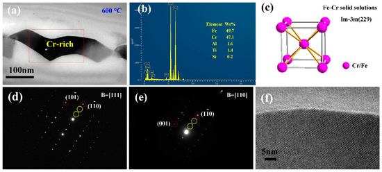 Two pole SAED patterns (Figure 7d,e) obtained from electron beam focalization reveal a predominance of the ordered diffraction spots; these are unambiguously associated with the Cr-rich phase (b). With the projection of the α′ phase in the smallest size, these two SAED patterns can be used to construct the three-dimensional structure of the candidate phase. The SAED patterns in Figure 7d,e can be indexed as [111] and [110] pole of α′ phase with space group (Im-3m, 229), respectively, whose constructed lattice cell is illustrated in Figure 7c. Two extra diffraction spots (marked in the yellow ring) lie between the central spot and (1–10) spot (marked in the red ring) in these two SAED patterns. This is the typical phenomenon of the ordered solid solution in the (1–10) plane. As the atomic scattering factor (fFe-fCr) is not equal to zero in the α′ phase, the forbidden diffraction spot marked in yellow 1/3(1–10) and 2/3(1–10) can be reflected as minor spots in the back focal plane. The ordered (1–10) plane may result in the enhanced {110} diffraction peak in the measured diffraction profiles.