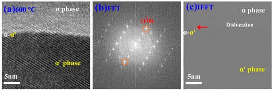 High-resolution transmission electron microscopy (HRTEM) is used to understand the interface between the α and α′ phases at the level of the atomic resolution. The α′ phase is always oriented along [1 1 1] zone axis and is coherent with the a-Fe matrix. As shown in the HRTEM image in Figure 7f, there is a clear interface between the α and α′ phases. Due to the very important role in image processing and pattern recognition in analyzing periodicity and repeating units, the Fast Fourier transform pattern (Figure 8b) was transformed from HRTEM images in Figure 8a to reveal the reciprocal information. The reciprocal spots using FFT, seen in Figure 8b, are consistent with the SAED pattern of the α′ phase, showing the uniform structure in the α′ phase. With only (1–10) and (−110) unmarked, the inverse fast Fourier transform (IFFT) image was retransformed from the reciprocal space, as shown in Figure 8c. The one-dimensional (1–10) lattice fringe is traversing the α and α′ phases, showing the close interconnection on the atomic scale and unit cell. The Rietveld analysis shows that the average spacing of {110} plane for α and α′ phases heat-treated at 600 °C are 2.1661 and 2.0473 Å, respectively. The spacing difference of 0.1188 Å causes the interface to form several dislocations (marked in red arrows in Figure 8c).