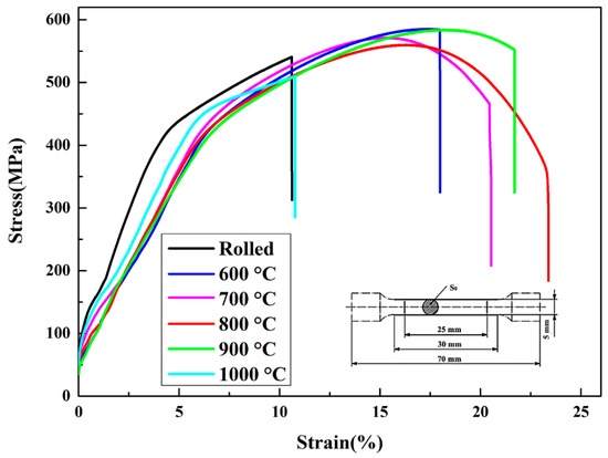 Engineering stress-strain curves for rolled and heat treated at 600~1000 °C of Fe-25Cr-5Al-RE wire rods.