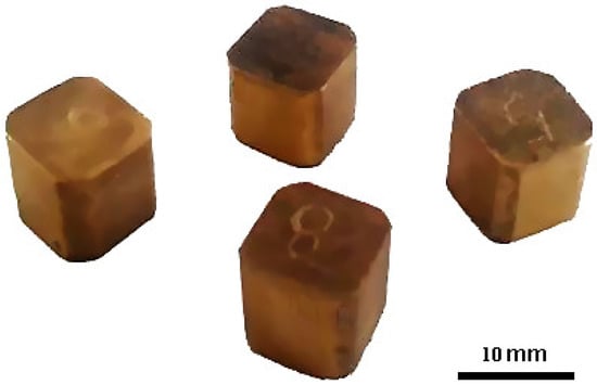 Up-drawing continuous casting H62 brass rod (manufactured by Boway Alloy Co., Ltd., Ningbo, China) was adopted as an initial material. The H62 brass rod was composed of 62.5% Cu, Fe 0.15%, 0.01% P, 0.002% Bi, and balance zinc (mass fraction). To achieve a contrast microstructure observation of H62 brass before and after compression, the side faces of the up-drawing continuous casting rod with a diameter of 8 mm were cut with a height of 6.5 mm, and the cross-section was a 7 × 7 mm square with four round corners radius of 4 mm. The cross-sections ensure that the initial and final microstructure can be obtained. The sample shape after machining is shown in Figure 1.