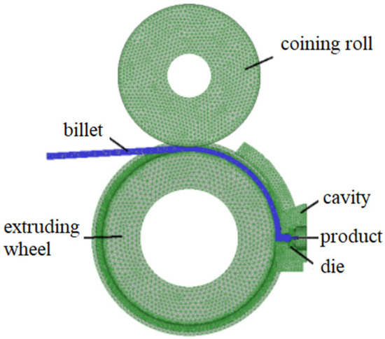 Deform numerical simulation software (DEFORM-3D V6.1) was used to simulate the continuous extrusion process of H62 brass as billet to produce H-shaped brass wire. In order to reduce the amount of calculation, the 1/2 models of extruding wheel, coining roll, die, cavity, and billet were established and then output as STL file, which was imported to Deform software and divided the mesh. The continuous extrusion schematic diagram and parameters are shown in Figure 3 and Table 2, respectively. All materials except billet are H13 steel. The friction model with the billet is the shear friction with a shear friction factor of 0.12, and the heat transfer factor is 30 N/sec/mm/°C.