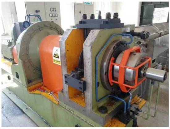 The H-shaped wire continuous extrusion experimental equipment was based on the TLJ250 continuous extrusion machine (manufactured by Dalian Konform Technical Co. Ltd., Dalian, China) as shown in Figure 4. The tooling die structure of H-shaped wire of the equipment is self-designed. The H62 billet and the die were preheated to 500 °C, the billet is the H62 brass rod prepared by continuous casting, the diameter is 8 mm, and the reduction of the compaction wheel is 2 mm.